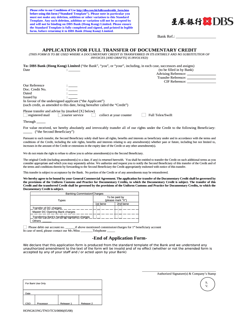 APPLICATION FOR FULL TRANSFER OF DOCUMENTARY CREDIT (THIS FORM IS TO BE USED WHERE A DOCUMENTARY CREDIT IS TRANSFERRED IN ITS ENTIRELY AND NO SUBSTITUTION OF INVOICES AND DRAFTS IS INVOLVED)To: DBS
