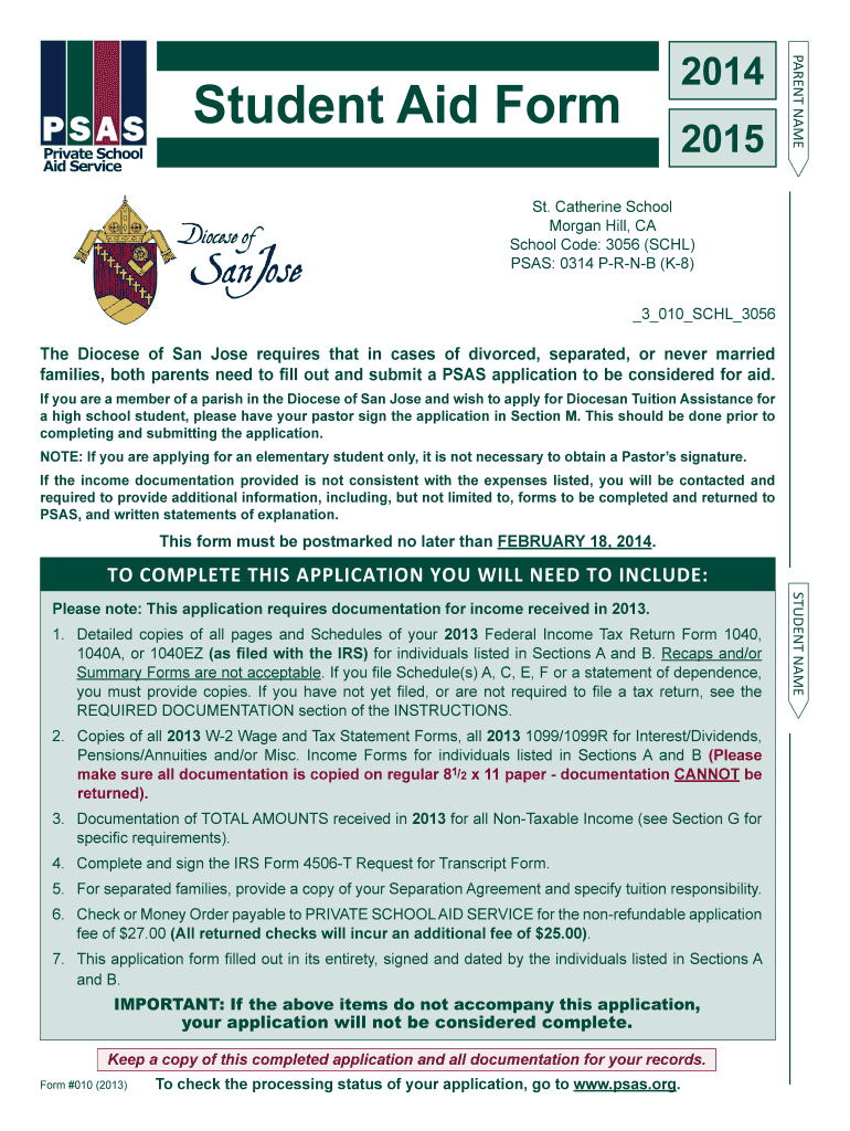 The 2014-2015 Student Aid Form is a financial aid application used by parents or guardians to apply for Diocesan Tuition Assistance for students at St. Catherine School in Morgan Hill, CA.