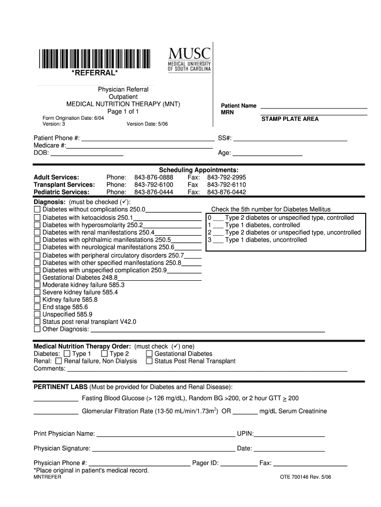 The form is intended for physicians who are referring patients for medical nutrition therapy, particularly for those requiring specialized nutritional care due to conditions such as diabetes or renal disease.