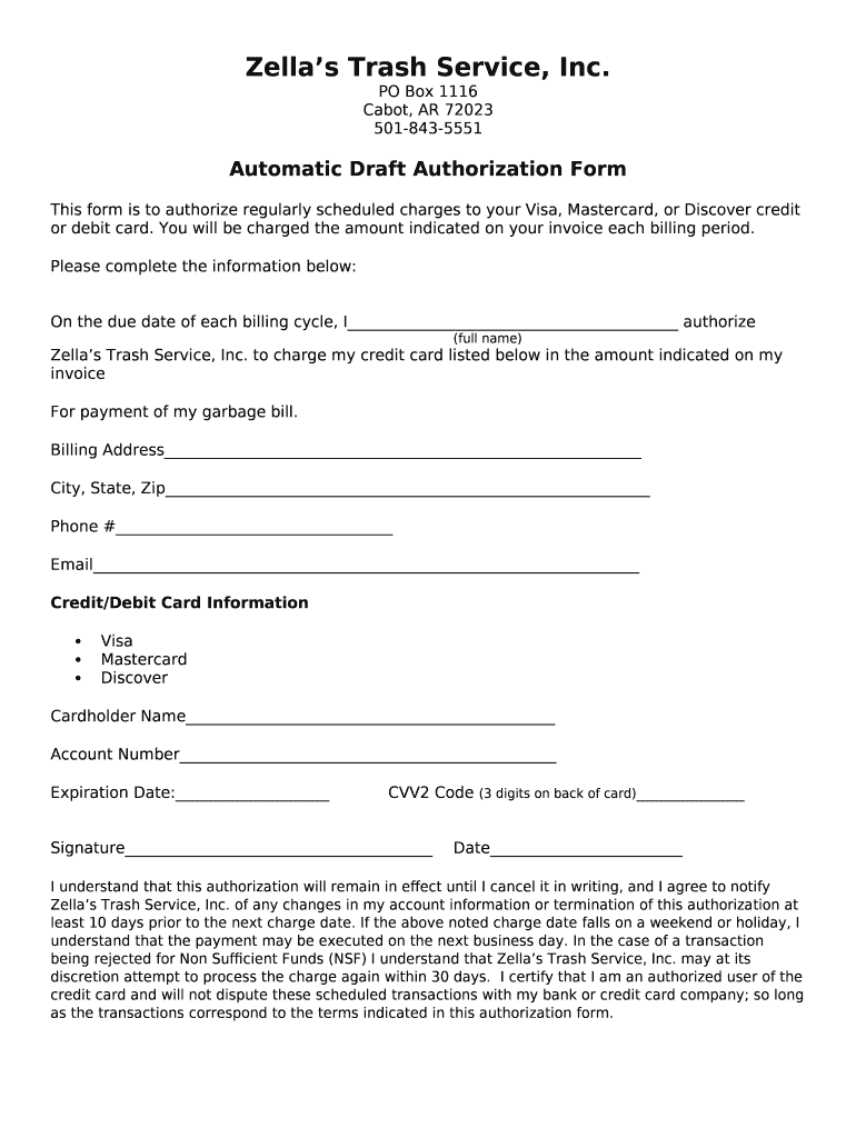 Fellas Trash Service, Inc. PO Box 1116 Cabot, AR 72023 5018435551Automatic Draft Authorization Forms form is to authorize regularly scheduled charges to your Visa, Mastercard, or Discover credit or