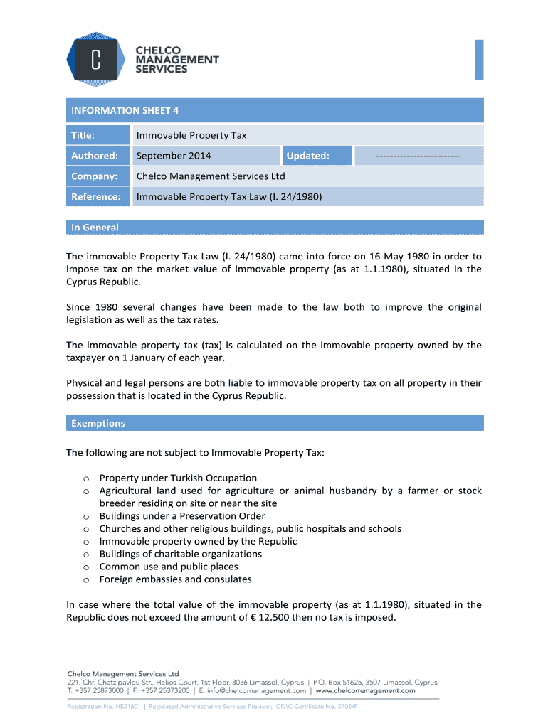 Title:Immovable Property Authored:September 2014Company:Check Management Services Reference:Immovable Property Tax Law (I. 24/1980)Updated:In General