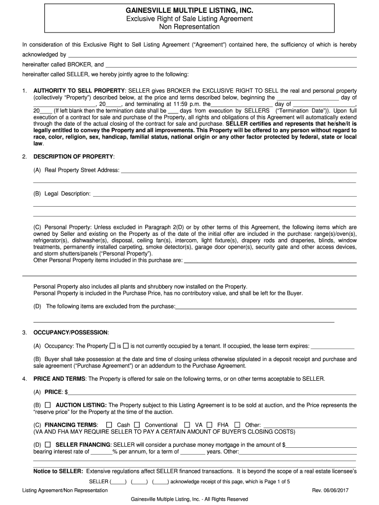 GAINESVILLE MULTIPLE LISTING, INC. Exclusive Right of Sale Listing Agreement Non Representation In consideration of this Exclusive Right to Sell Listing Agreement (Agreement) contained here, the sufficiency