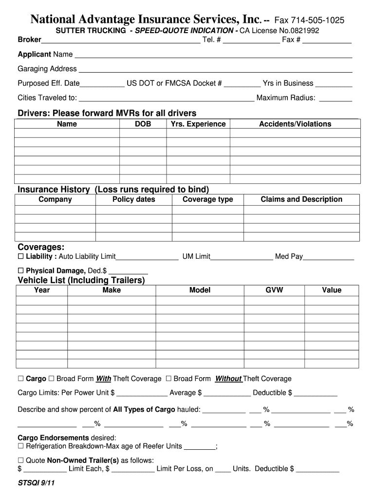 The primary purpose of the Sutter Trucking Speed-Quote Indication is to assist trucking companies in acquiring timely insurance quotes. By using this form, users can benefit from a streamlined process that minimizes delays and ensures they receive comprehensive coverage options. Coverage can include liability, physical damage, and cargo insurance, which are critical for maintaining compliance and safeguarding assets.