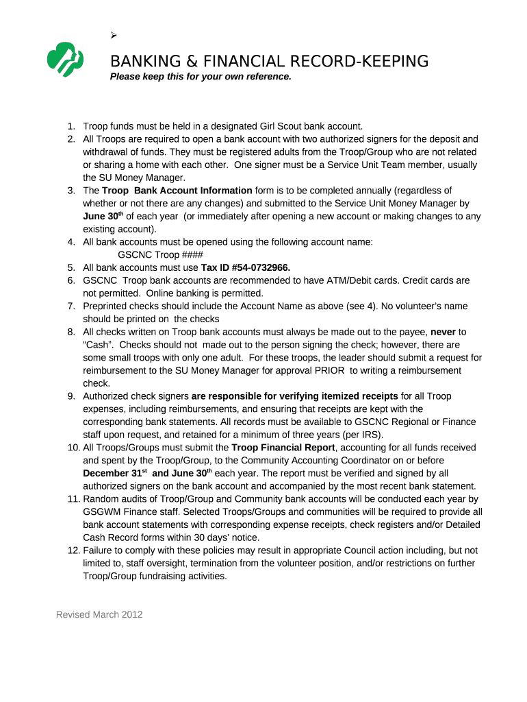 BANKING & FINANCIAL RECORDKEEPINGPlease keep this for your own reference.1. Troop funds must be held in a designated Girl Scout bank account.2. All Troops are required to open a bank account with
