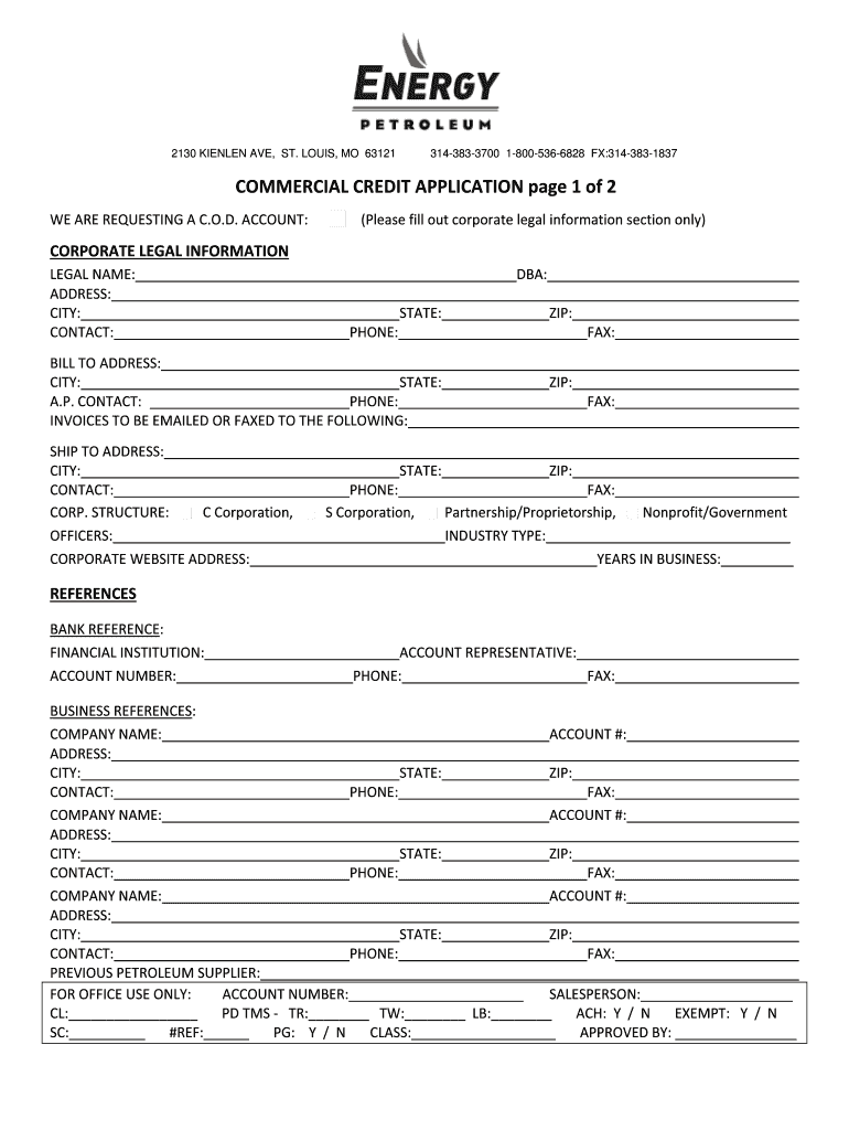 The Commercial Credit Application is a business form used by Energy Petroleum to evaluate potential customers requesting credit.