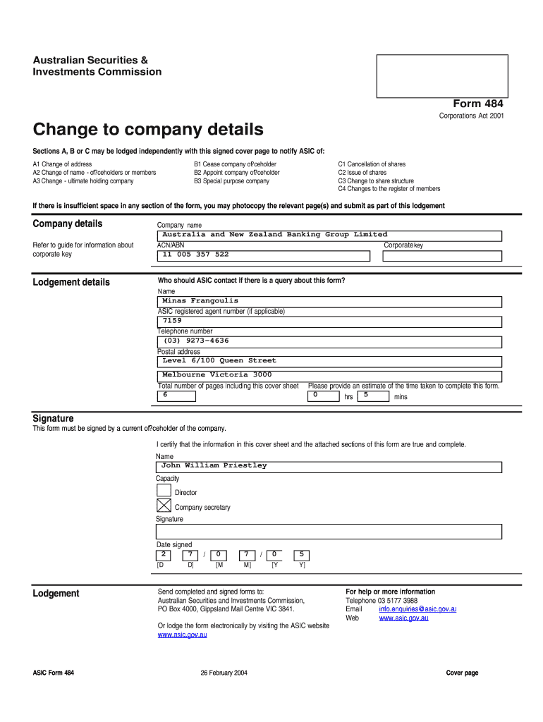 Australian Securities & Investments Commissioner 484 Corporations Act 2001Change to company details Sections A, B or C may be lodged independently with this signed cover page to notify ASIC of: A1