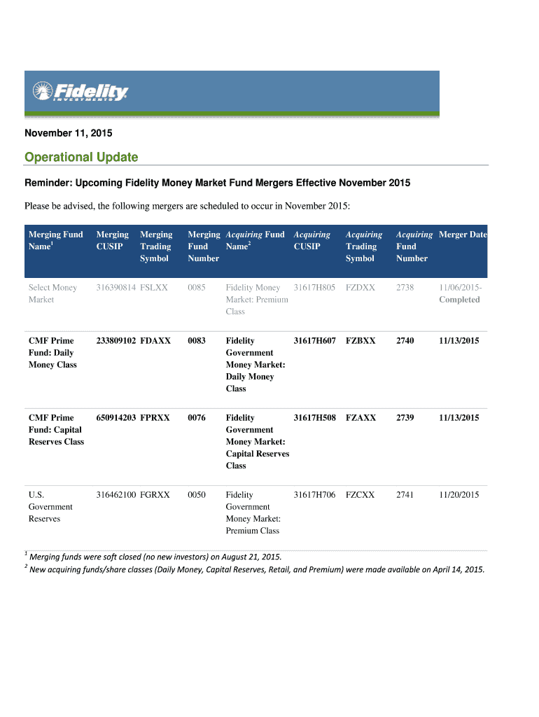 Get the free Reminder: Upcoming Fidelity Money Market Fund Mergers Effective November 2015