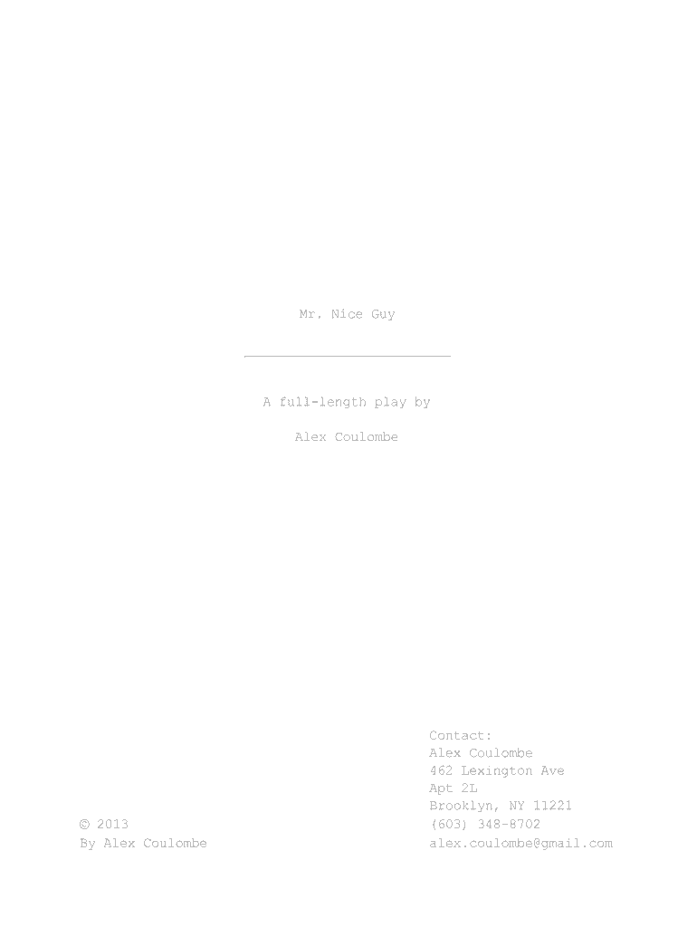 Mr. Nice Guy A full length play by Alex Coulomb 2013 By Alex CoulombeContact: Alex Coulomb 462 Lexington Ave Apt 2L Brooklyn, NY 11221 (603) 3488702 Alex. Coulomb Gmail.comic.CAST OF CHARACTERS FELIX