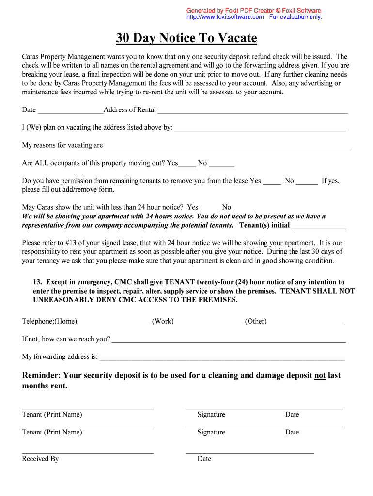 Both the tenant planning to vacate and a representative of the property management must sign the 30 Day Notice To Vacate to ensure validity.