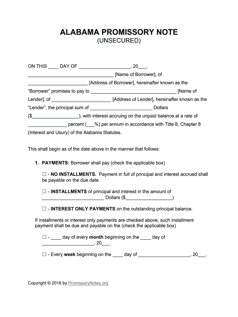ALABAMA PROMISSORY NOTE (UNSECURED)ON THIS DAY OF, 20, Name of Borrower, of Address of Borrower, hereinafter known as the Borrower promises to pay to Name of Lender, of Address of Lender, hereinafter