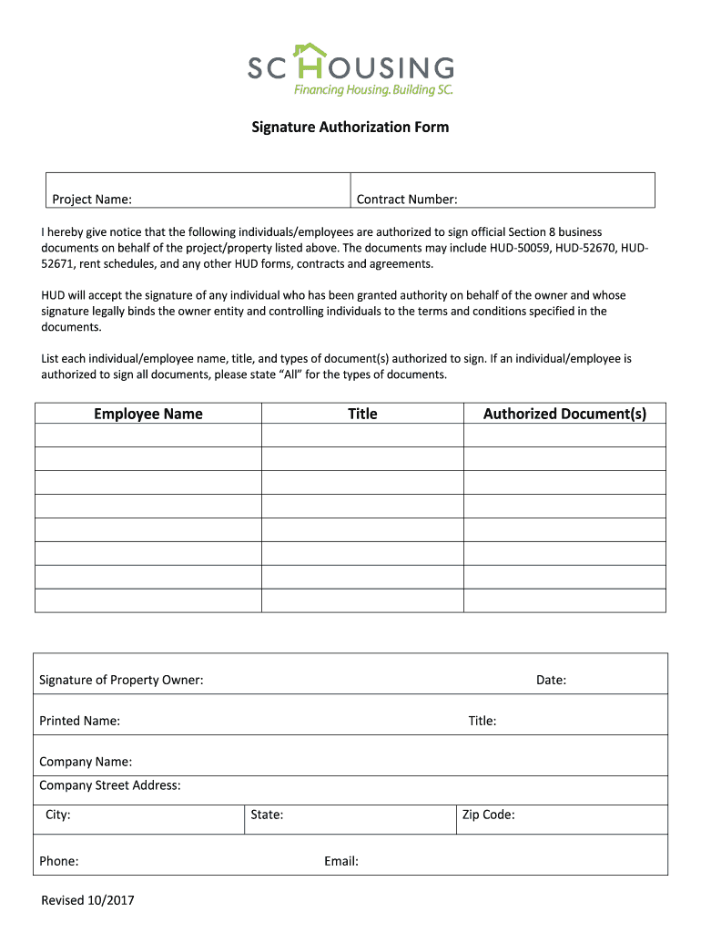 Signature Authorization FormProject Name:Contract Number:I hereby give notice that the following individuals/employees are authorized to sign official Section 8 business