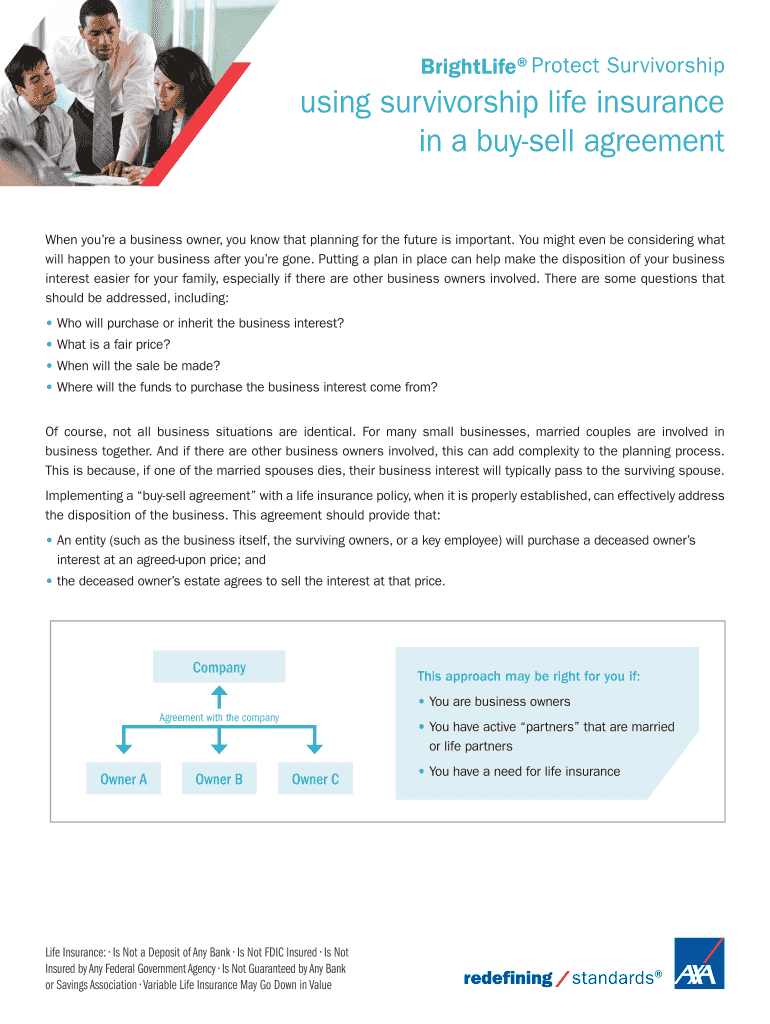 BrightLifeProtect Survivorshipusing survivorship life insurance in a buy sell agreement When you're a business owner, you know that planning for the future is important. You might even be considering