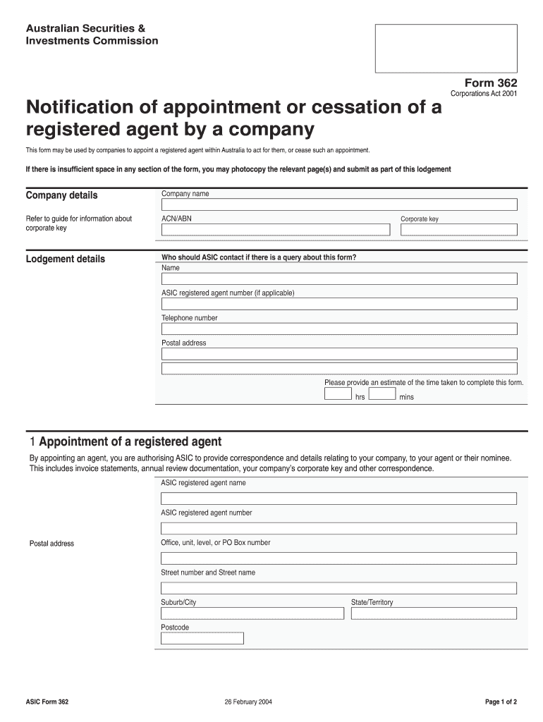 Australian Securities & Investments Commissioner 362Corporations Act 2001Notification of appointment or cessation of a registered agent by a company This form may be used by companies to appoint a