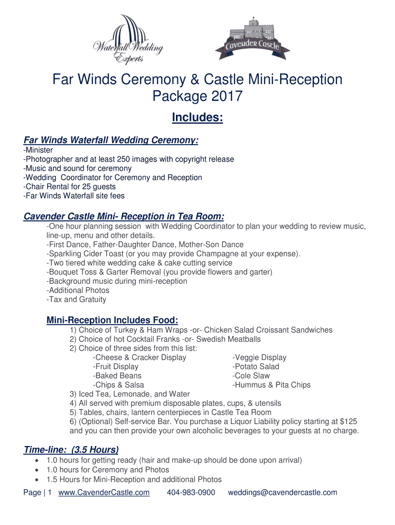 Far Winds Ceremony & Castle MiniReception Package 2017 Includes: Far Winds Waterfall Wedding Ceremony: Minister Photographer and at least 250 images with copyright release Music and sound for ceremony