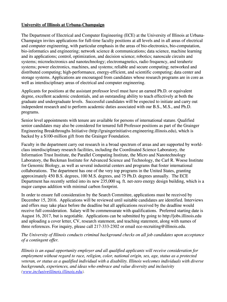 University of Illinois at UrbanaChampaign The Department of Electrical and Computer Engineering (ECE) at the University of Illinois at UrbanaChampaign invites applications for full time faculty positions