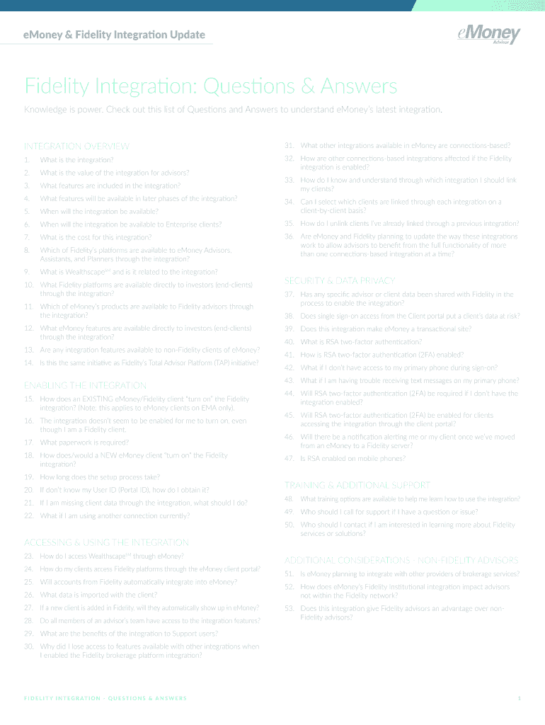 Money & Fidelity Integration UpdateFidelity Integration: Questions & Answers Knowledge is power. Check out this list of Questions and Answers to understand moneys the latest integration. INTEGRATION