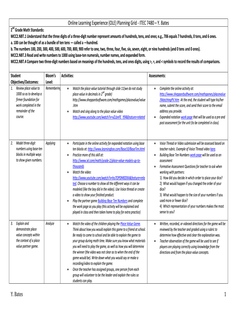 Online Learning Experience (OLE) Planning Grid ITEM 7480 Y. Bates nd2 Grade Math Standards: MCC2.NBT.1 Understand that the three digits of a three-digit number represent amounts of hundreds, tens,