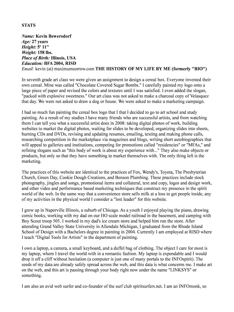 STATS Name: Kevin Beiersdorf Age: 27 years Height: 5 11 Weight: 158 lbs. Place of Birth: Illinois, USA Education: BFA 2004, RISE Email: Kevin (at) maximumsorrow.com THE HISTORY OF MY LIFE BY ME (formerly
