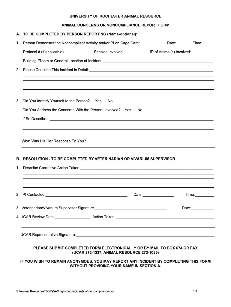 UNIVERSITY OF ROCHESTER ANIMAL RESOURCE ANIMAL CONCERNS OR NONCOMPLIANCE REPORT FORM A. TO BE COMPLETED BY PERSON REPORTING (Name optional): 1. Person Demonstrating Noncompliant Activity and/or PI
