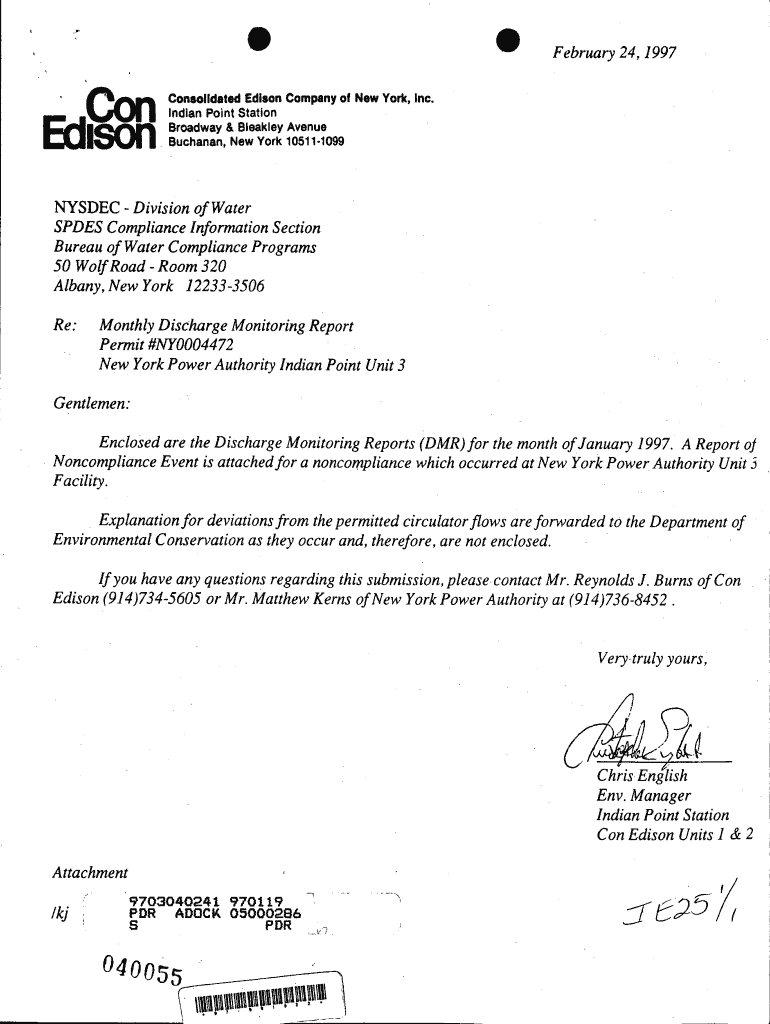 0 February 24, 1997, Coal Soil E Consolidated Edison Company of New York, Inc. Indian Point Station Broadway & Bleakly Avenue Buchanan, New York 105111099 NYSE Division of Water SIDES Compliance Information