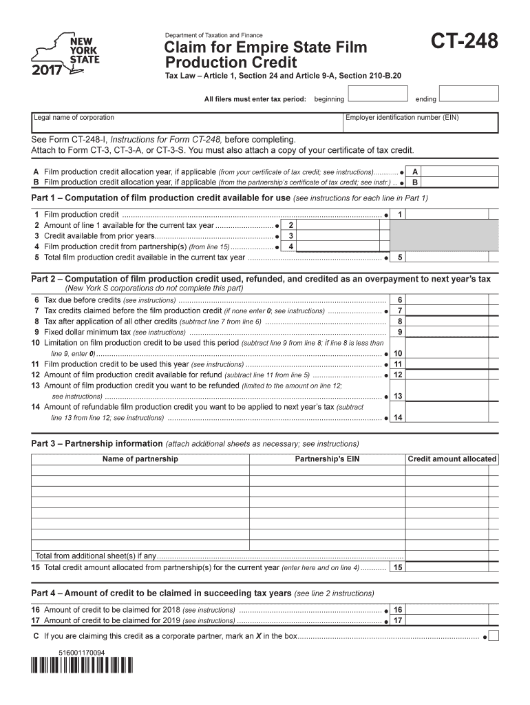 CT248Department of Taxation and FinanceClaim for Empire State Film Production Credit Law Article 1, Section 24 and Article 9A, Section 210B.20 All filers must enter tax period:Legal name of corporationbeginningending