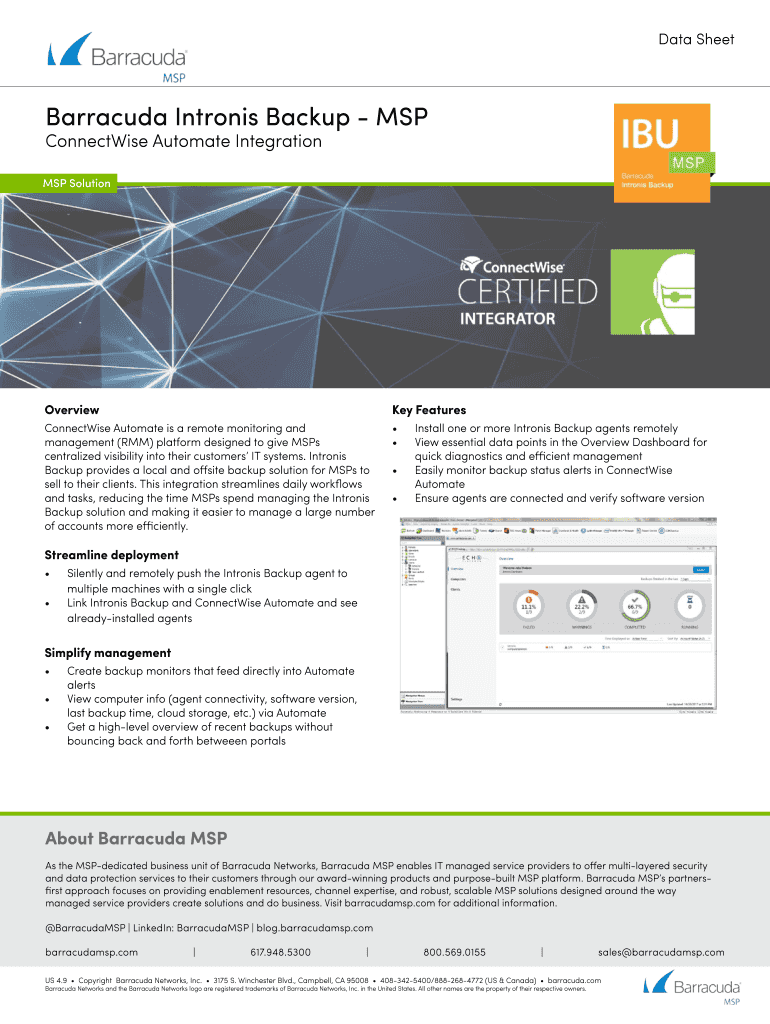 Data SheetBarracuda Introns Backup MAP Connect Wise Automate IntegrationText here. MAP SolutionOverviewKey FeaturesConnectWise Automate is a remote monitoring and management (RMM) platform designed
