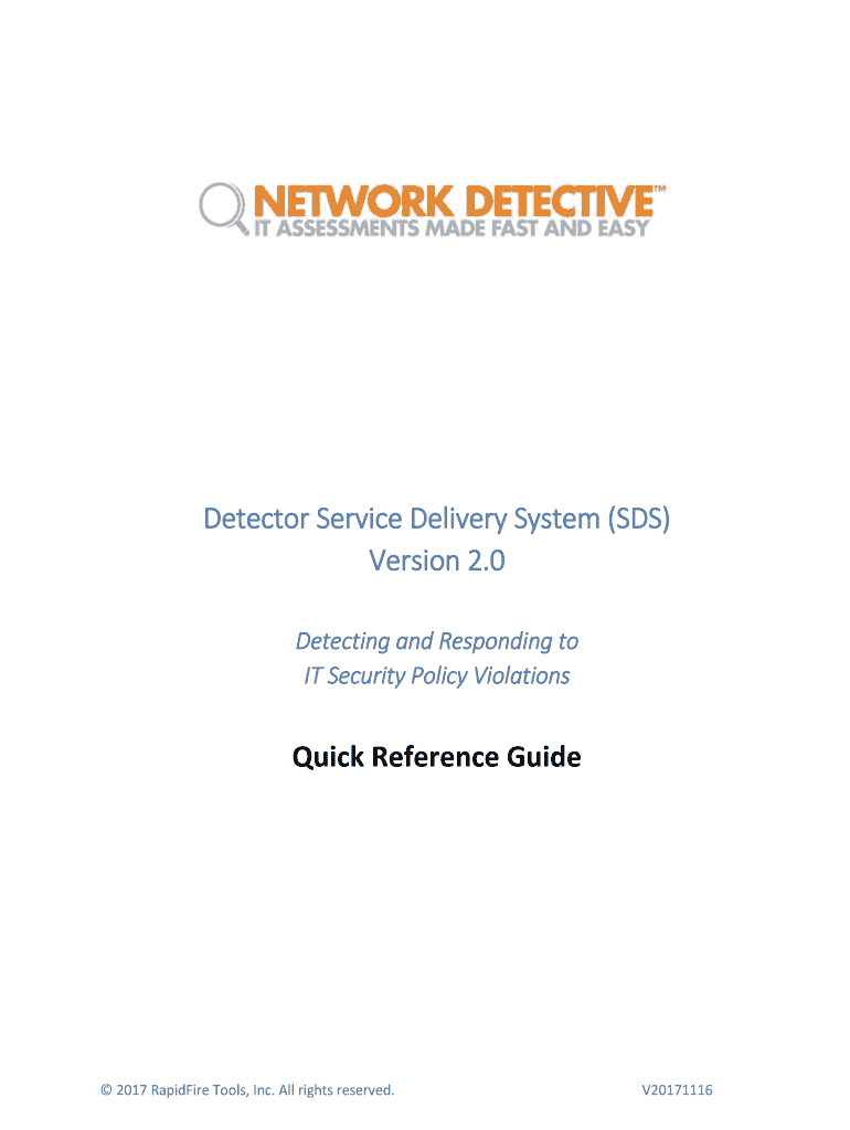 Detector Service Delivery System (SDS) Version 2.0 Detecting and Responding to IT Security Policy ViolationsQuick Reference Guide 2017 Rapidity Tools, Inc. All rights reserved. V20171116Network DetectiveDetector