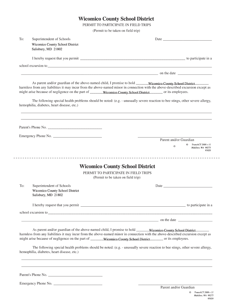 The Wicomico County Field Trip Permit is a permission form used by parents in Maryland to authorize their child's participation in a school excursion.