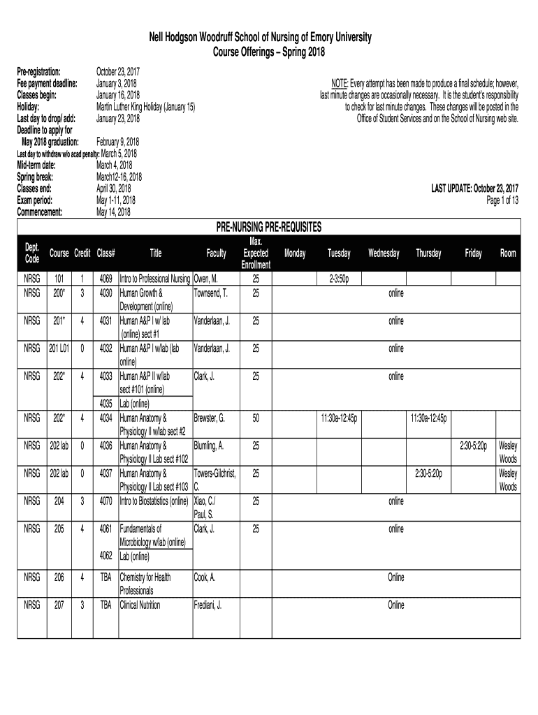 Nell Hodgson Woodruff School of Nursing of Emory University Course Offerings Spring 2018 Preregistration: Fee payment deadline: Classes begin: Holiday: Last day to drop/ add: Deadline to apply for
