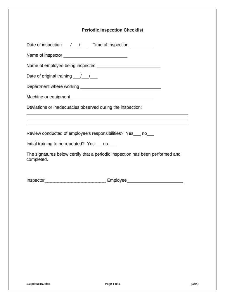 Periodic Inspection ChecklistDate of inspection / / Time of inspection Name of inspector Name of employee being inspected Date of original training / / Department where working Machine or equipment