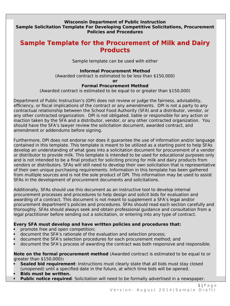 Sample Solicitation Template For Developing Competitive Solicitations, Procurement Policies and ProceduresSample Template for the Procurement of Milk and