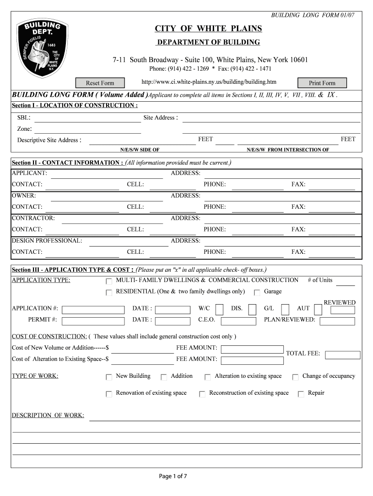 BUILDING LONG FORM 01/07 CITY OF WHITE PLAINS DEPARTMENT OF BUILDING 7-11 South Broadway Suite 100, White Plains, New York 10601 Phone: (914) 422 1269 * Fax: (914422 147171 http://www.ci.white-plains.ny.us/building/building.htm