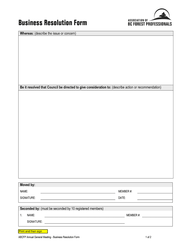 Business Resolution Form Whereas: (describe the issue or concern)Be it resolved that Council be directed to give consideration to: (describe action or recommendation)Moved by: NAME:MEMBER #:SIGNATURE:DATE:Seconded