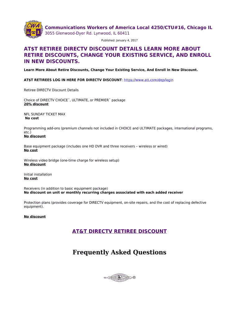 Published: January 4, 2017AT×T RETIREE DirecTV DISCOUNT DETAILS LEARN MORE ABOUT