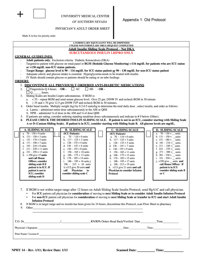 +UNIVERSITY MEDICAL CENTER OF SOUTHERN NEVADAAppendix 1: Old ProtocolPHYSICIANS ADULT ORDER SHEET Mark X in box for priority order A FORMULARY EQUIVALENT WILL BE DISPENSED UNLESS FORMULARY DRUG REQUEST