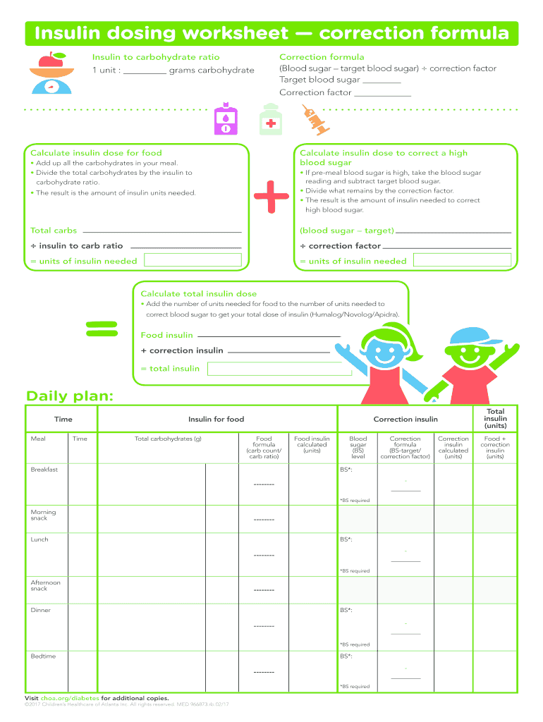 Insulin dosing worksheet correction formula Insulin to carbohydrate ratio 1 unit : grams carbohydrateCorrection formula (Blood sugar target blood sugar) correction factor Target blood sugar Correction