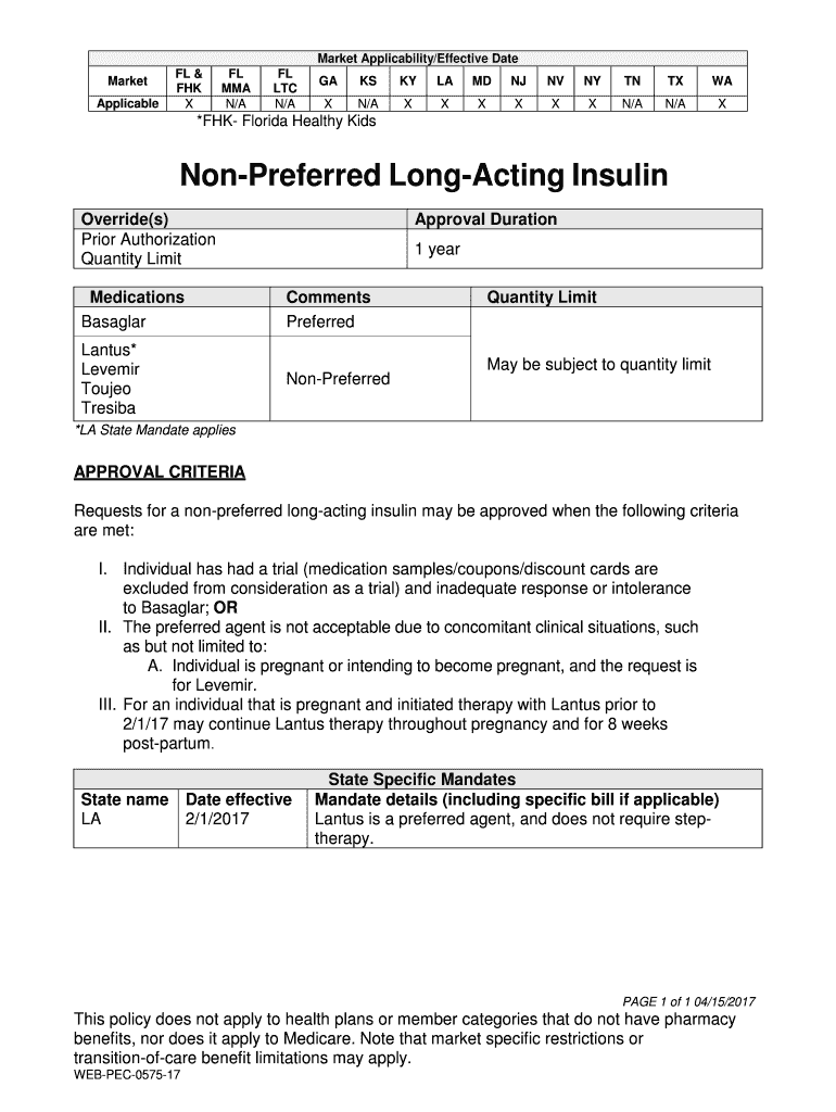 Market Applicability/Effective Date Market Applicable FL & HK XFL MMA N/AFL LTC N/AGAKSKYLAMDNJNVNYTNTXWAXN/AXXXXXXN/AN/AX×HK Florida Healthy KidsNonPreferred Contacting Insulin Override(s) Prior
