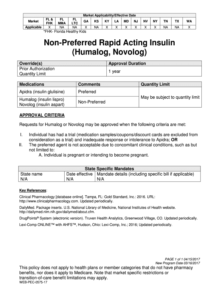 Market Applicability/Effective Date FL & HK Market Applicable FL MMA NFL LTC NAGAKSKYLAMDNJNVNYTNTXWAXNAXXXXXXNANAX×HK Florida Healthy KidsNonPreferred Rapid Acting Insulin (Humalog, Novel) Override(s)