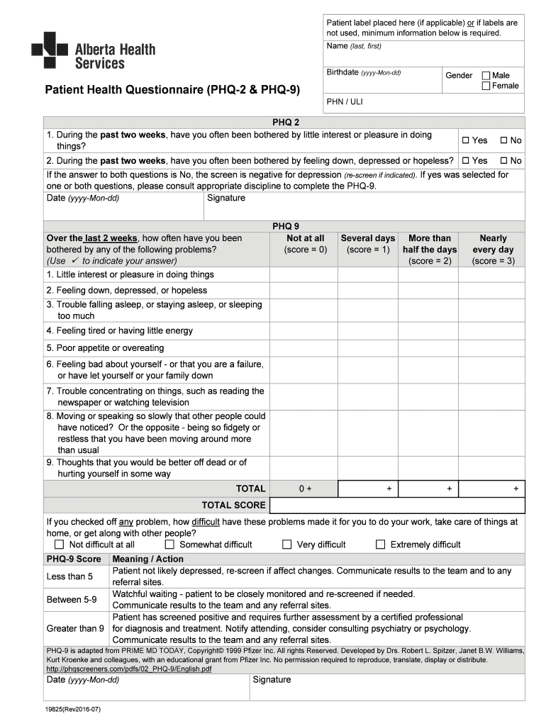 Patient label placed here (if applicable) or if labels are not used, minimum information below is required. Name (last, first) Birthdate (yyyyMondd)GenderPatient Health Questionnaire (PHQ2 & PHQ9)