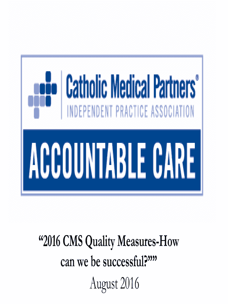 2016 CMS Quality Measures can we be successful? August 2016ACO Announcements Reminders: ACO Notifications Requests for Tax ID information from PECOS 2016 SSP Population Reports Upcoming provider/Office
