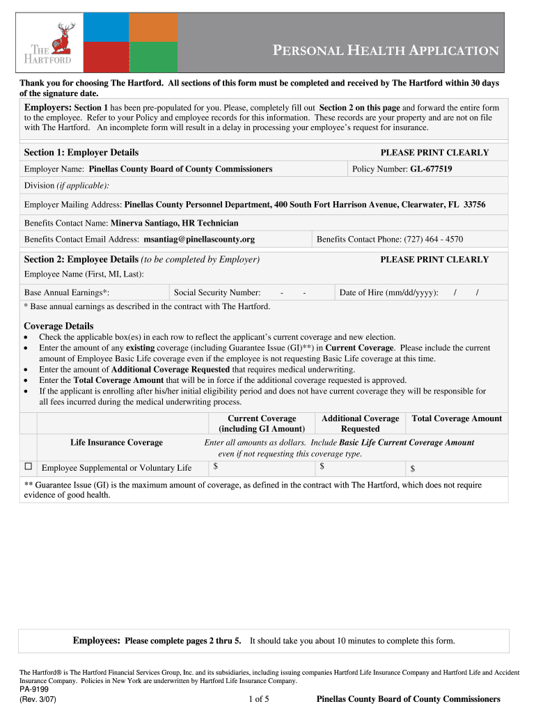 The Personal Health Application is a crucial document for employees in Florida, specifically designed for those working with the Pinellas County Board of County Commissioners. Its primary purpose is to facilitate access to health insurance coverage through The Hartford. To complete this process effectively, employees must provide essential personal details and their medical history.
