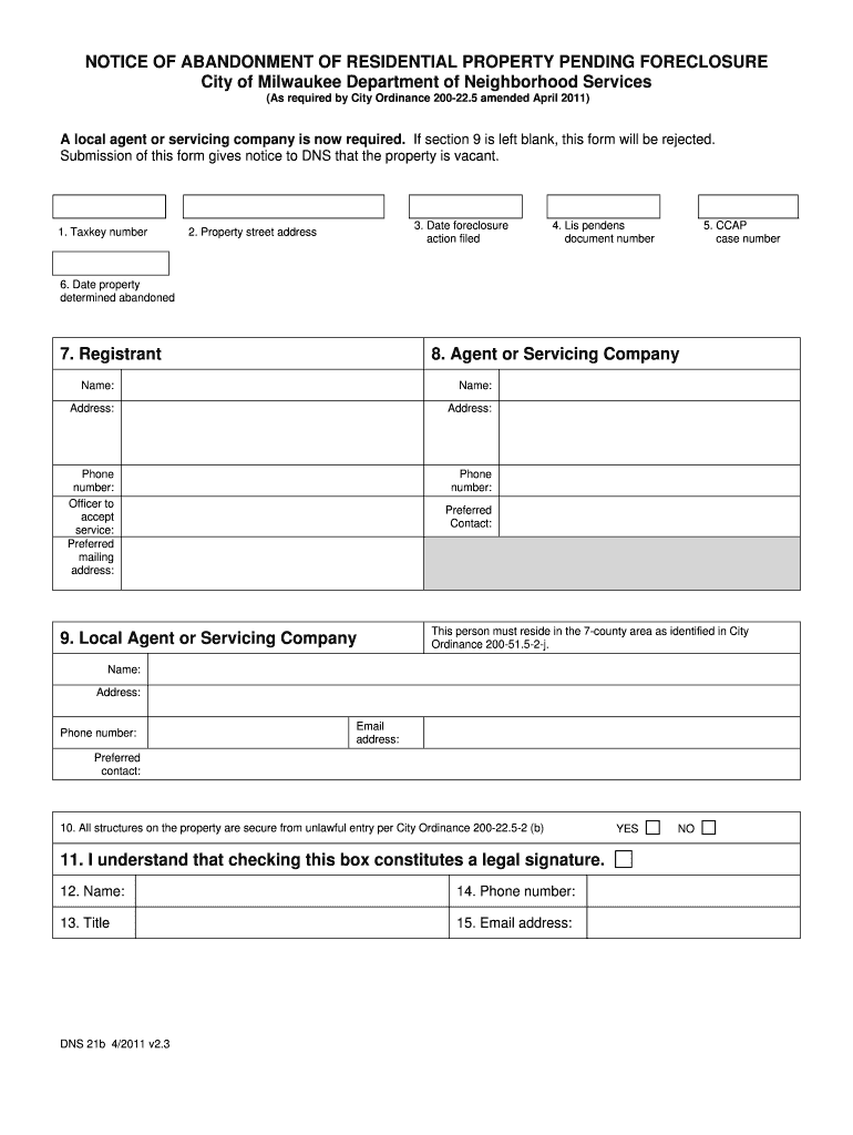NOTICE OF ABANDONMENT OF RESIDENTIAL PROPERTY PENDING FORECLOSURE City of Milwaukee Department of Neighborhood Services (As required by City Ordinance 200-22.5 amended April 2011) A local agent or