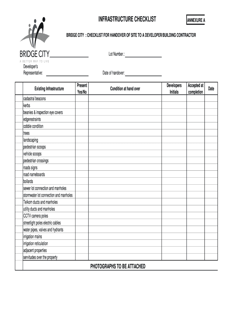 INFRASTRUCTURE CHECKLISTANNEXURE ABRIDGE CITY : CHECKLIST FOR HANDOVER OF SITE TO A DEVELOPER/BUILDING CONTRACTOR Development Name:Lot Number.:Developer's Representative: Existing InfrastructureDate
