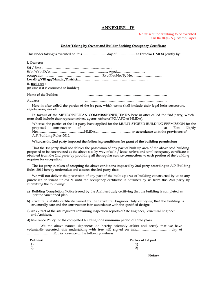Appendix IV Notarized undertaking to be executed On Rs.100/ N.J. Stamp Paper Undertaking by Owner and Builder Seeking Occupancy Certificate This under taking is executed on this day of. At Tarn aka