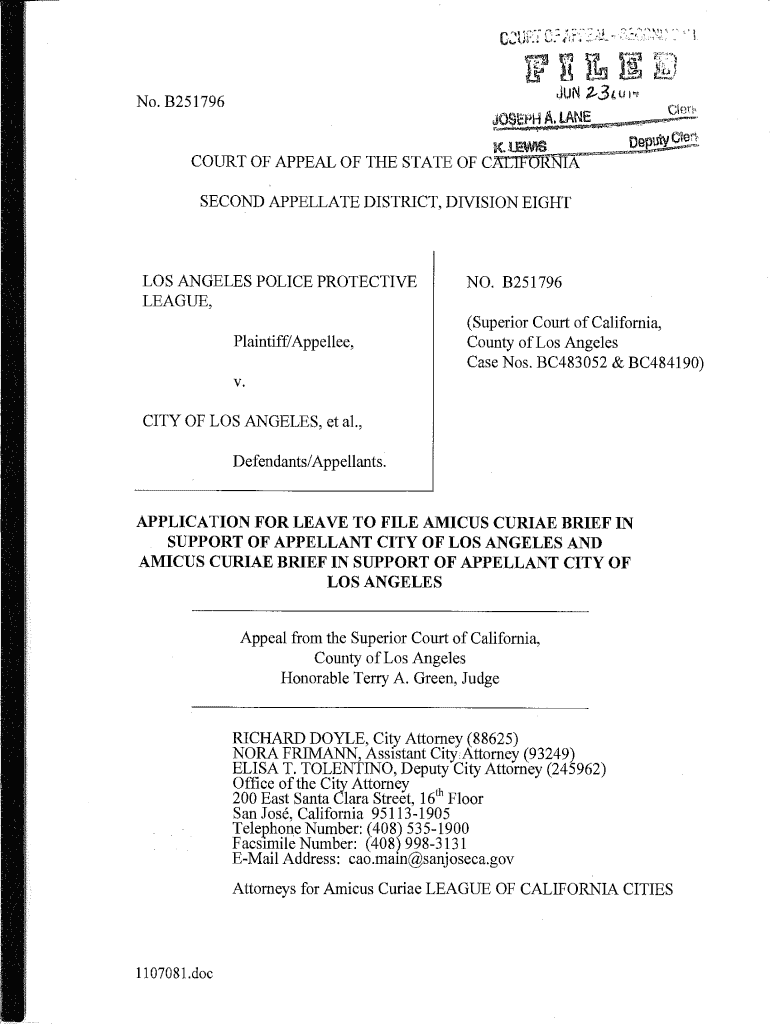 No. B251796COURT OF APPEAL OF THE STATE OF CALIFORNIA SECOND APPELLATE DISTRICT, DIVISION EIGHTIES ANGELES POLICE PROTECTIVE LEAGUE, Plaintiff! Appealed, NO. B251796 (Superior Court of California,