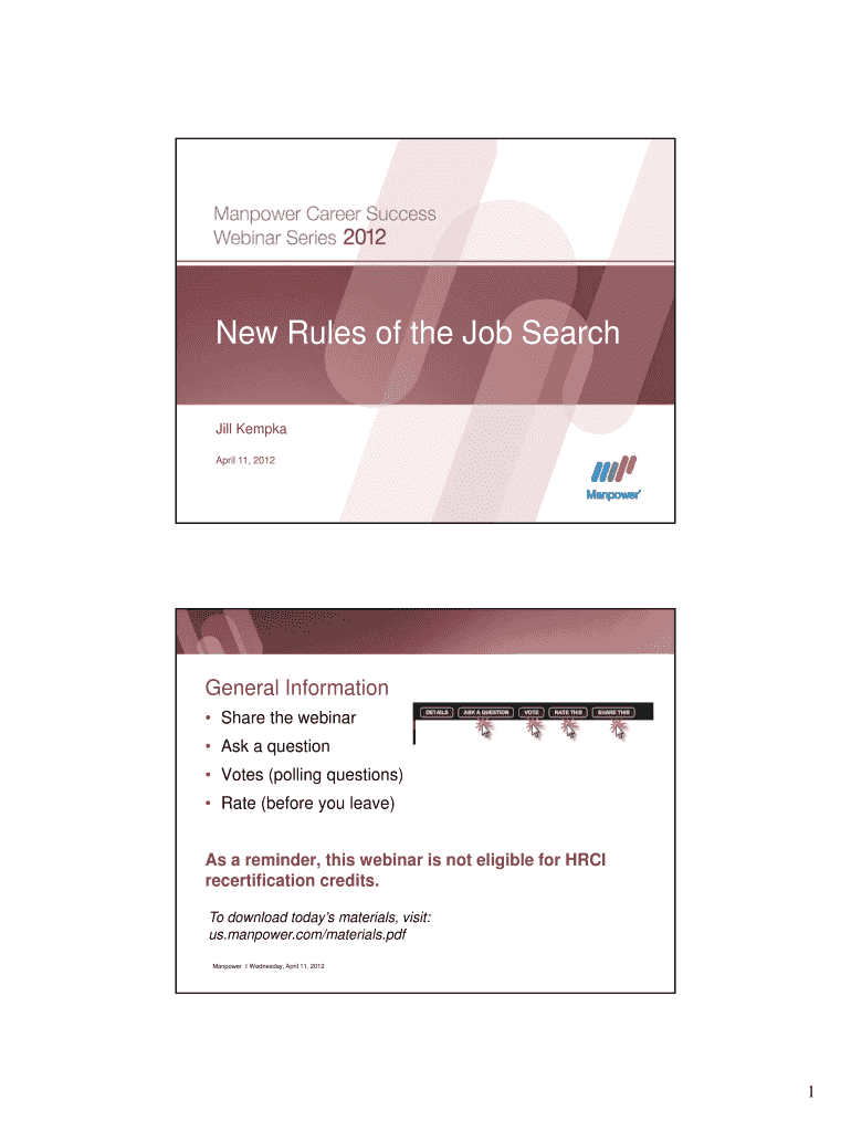 New Rules of the Job Search Jill Kempis April 11, 2012General Information Share the webinar Ask a question Votes (polling questions) Rate (before you leave) As a reminder, this webinar is not eligible