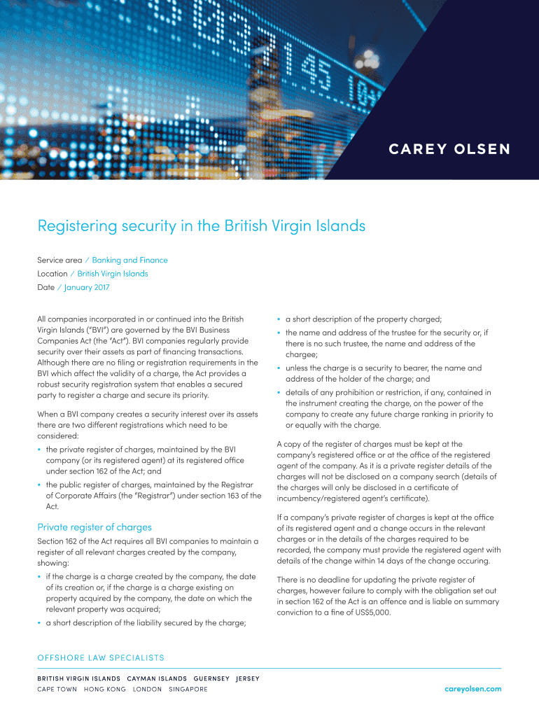 Registering security in the British Virgin Islands Service area Banking and Finance Location British Virgin Islands Date January 2017All companies incorporated in or continued into the British Virgin
