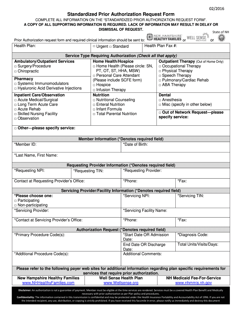 The Standardized one-page Prior Authorization Request Form is to be used by all NH Medicaid Fee for