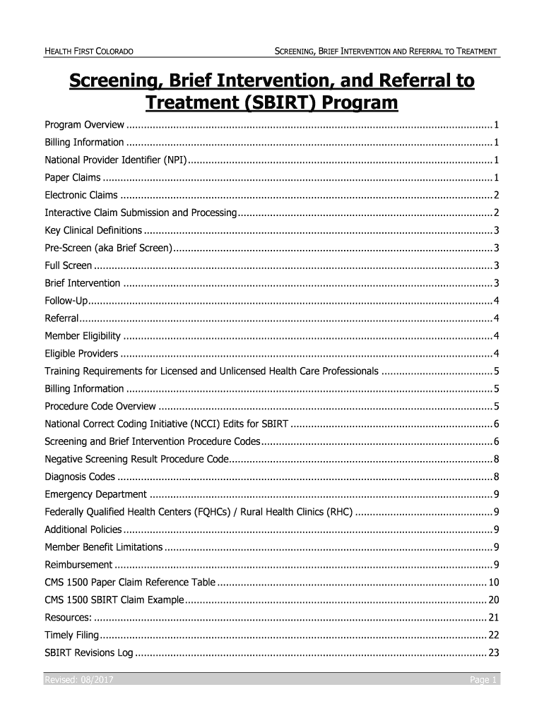 HEALTH FIRST COLORADOSCREENING, BRIEF INTERVENTION AND REFERRAL TO TREATMENTScreening, Brief Intervention, and Referral to