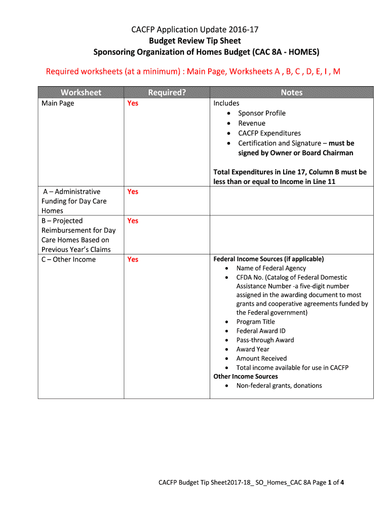 CA CFP Application Update 201617 Budget Review Tip Sheet Sponsoring Organization of Homes Budget (CAC 8A HOMES) Required worksheets (at a minimum) : Main Page, Worksheets A, B, C, D, E, I, M WorksheetMain